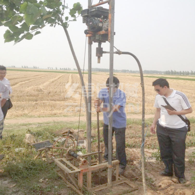 一、ZT300打井機(jī)主要是用在哪里的?鉆井機(jī)適用于土層、巖層、卵礫層、膠結(jié)卵礫層等復(fù)雜地層,ZT300柴油機(jī)打井機(jī)也叫鉆井機(jī)廣泛應(yīng)用于高層建筑、大型橋梁工程、水利建設(shè)、農(nóng)田工程等領(lǐng)域的地基基礎(chǔ)工程施工,是大直徑深基礎(chǔ)工程施工的理想設(shè)備。打井機(jī)組成:柴油機(jī)、離合器、鉆具、車架、轉(zhuǎn)盤、傳動(dòng)軸等。二、ZT300打井機(jī)也叫鉆井機(jī)規(guī)格參數(shù)有哪些?型號(hào):ZT300 鉆孔深度:30-80m 鉆孔直徑:70-350mm鉆孔角度:90°鉆桿直徑:42-48立軸轉(zhuǎn)速:200重量:0.135噸外形尺寸:1100*600*500mmZT300打井機(jī)也叫鉆井機(jī)它是針對(duì)平原地區(qū)而設(shè)計(jì)的一款輕便型鉆機(jī),不適應(yīng)較硬地石的鉆打,對(duì)砂礓、鵝卵石、風(fēng)化石與紅磚仿佛硬的石頭的鉆打比較理想。ZT300打井機(jī)也叫鉆井機(jī)特點(diǎn):質(zhì)量輕,主機(jī)135千克;易操作,有無經(jīng)驗(yàn)均可使用;壽命長,第一代產(chǎn)品使用13年至今,打井4000余眼,除鉆頭外,幾乎不用修理;能打硬,鑲有硬質(zhì)合金,(除較堅(jiān)硬的厚石層均可鉆透;能打深,設(shè)有提升器,減輕了勞動(dòng)強(qiáng)度;效益高,平原地區(qū)每小時(shí)可打20多米,家庭兩名成員每天能打2--3眼;三、ZT300打井機(jī)也叫鉆井機(jī)是如何操作的?ZT300打井機(jī)也叫鉆井機(jī)鉆打1.在主機(jī)下方連接鉆頭和鉆桿,啟動(dòng)汽油機(jī)(按汽油機(jī)使用說明書使用)。1.水泵送水。隨時(shí)將鉆頭鉆松的土沖出,經(jīng)沉淀池,流淌到泥漿池中。2.鉆打泥土層時(shí),用清水效果很好;但是打砂土層時(shí),一定要用泥漿水。ZT300柴油機(jī)打井機(jī)也叫鉆井機(jī)在水泵能抽動(dòng)的情況下泥漿俞稠愈好。稠的泥漿有利于將大量的沙子拖出。3.鉆桿鉆打完成后,不要立即提起,使其繼續(xù)供水、旋轉(zhuǎn),將鉆桿在孔中來回起落。一方面使井壁更加光滑,另一方面將盡可能多的沙子沖出井口。4.將機(jī)器適當(dāng)上提,卸下鉆桿,再將主機(jī)頭提至最上端,接上新的鉆桿,繼續(xù)鉆打。直至理想深度。5.鉆打過程中,要留意沙層的深度,因?yàn)樯硨雍看螅芟露朔旁谏硨拥牟糠忠@出部分過水孔。如果鉆孔部分在泥層,會(huì)影響水質(zhì)。6.ZT300打井機(jī)也叫鉆井機(jī)鉆打完畢,將主機(jī)頭移位到機(jī)架的內(nèi)側(cè),用定滑輪直接快速地將鉆桿逐節(jié)提出。7.直徑28的鉆桿,推薦開孔直徑120毫米以內(nèi),深度最深記錄98米(不同的土質(zhì)和水泵,效果不同)。34鉆桿推薦最大開孔口徑160毫米,深度30米左右。安裝水管、洗井、取水1.將PVC管子的下端用紗網(wǎng)(擋蚊蟲用的塑料網(wǎng))雙層扎封;及放在底部鉆孔的管子也用紗網(wǎng)(注意)纏繞一層。2.取水。新安放好的水管周圍有較多的泥漿,直接抽水,泥沙會(huì)將紗網(wǎng)封堵,導(dǎo)致水管內(nèi)成為真空狀態(tài)。所以,第一步是向水管內(nèi)高壓灌清水,逐步將紗網(wǎng)周圍的泥漿沖洗、稀釋。第二步用壓水井頭向上提水。直至壓水時(shí),感覺相對(duì)輕松為止。間斷性的提水,有利于進(jìn)一步清理紗網(wǎng)周圍的細(xì)泥沙。第三步安裝自吸水泵,進(jìn)行抽水,打井完成。新型鉆井機(jī)改變了鉆井軸的設(shè)計(jì),由齒輪聯(lián)動(dòng)改成直連,大大提高了機(jī)器的效率,減少了故障率。QYJ-300打井機(jī)產(chǎn)品特點(diǎn):